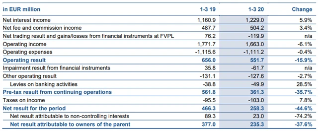 Kapitálová přiměřenost CET 1 byla na konci března 13,1 %, na konci roku 2019 dosahovala 13,7 % a na konci března 2019 činila 13,2 %. Opravné položky za letošní první čtvrtletí dosáhly 61,7 milionu eur, za celý loňský rok to bylo 39,2 milionu eur.