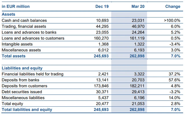 Vzrostl objem úvěrů i vkladů klientů. Úvěry poskytnuté klientům stouply ke konci března na 161,12 miliardy eur ze 151,96 miliardy eur před rokem a vklady klientů se zvýšily na 182,21 miliardy eur ze 166,22 miliardy eur.