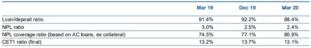 Poměr nesplácených úvěrů k celkovému objemu úvěrů klesl meziročně z 3,0 % na 2,4 %. Poměr úvěrů ke vkladům dosahoval na konci března 88,4 %, na konci loňského roku byl 92,2 % a na konci března 2019 činil 91,4 %.