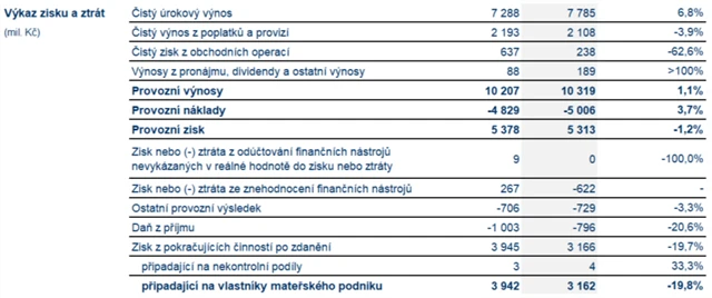 "Důležitým přispěvatelem k finančním výsledkům České spořitelny byl provozní zisk, zejména čistý úrokový výnos. K provoznímu zisku přispěl také čistý výnos z poplatků a provizí," uvedla banka v tiskové zprávě.