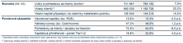 Hrubý objem klientských úvěrů skupiny očištěný o vliv reverzních repo operací meziročně vzrostl o 6,1 % na 759,1 miliardy korun. Objem úvěrů domácnostem stoupl o 7,2 % na 415,9 miliardy korun, a to především díky hypotékám fyzickým osobám. Objem úvěrů podnikatelským subjektům se bez vlivu reverzních repo operací zvýšil o 4,7 % na 270,9 miliardy korun, přičemž byl částečně ovlivněn změnami kurzu koruny.