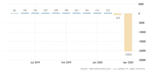 Ve Spojených státech v dubnu mimo zemědělství zaniklo asi 20,5 milionu pracovních míst. Analytici odhadovali, že ekonomika přišla asi o 22 milionů míst po úbytku 870 tisíc v březnu (revidováno z -701 tisíc). Míra nezaměstnanosti vystřelila na 14,7 % z 4,4 %, čekal se skok na 14 %. Údaje v pátek zveřejnilo ministerstvo práce USA. Meziroční růst mezd v dubnu zrychlil na 7,9 z 3,3 %. A připomeňme, že akciový trh v USA se po zveřejnění dat zvedl o více než 1,5 %.