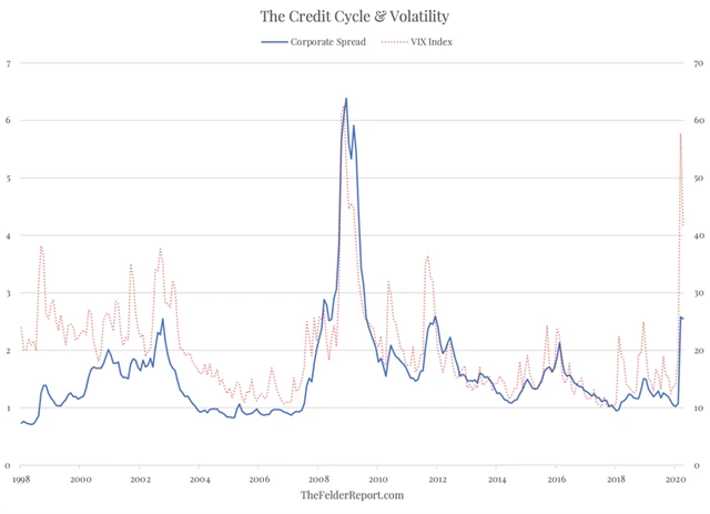 Jedním z mnoha důsledků koronavirové krize je zpřísňování úvěrových standardů, což pro změnu vede k růstu spreadů v korporátním sektoru. A vývoj korporátních spreadů je zase silně korelován s vývojem volatility na akciových trzích, protože narůstající problémy společností s dluhovým financováním se silně promítají i do nálady na burzách.