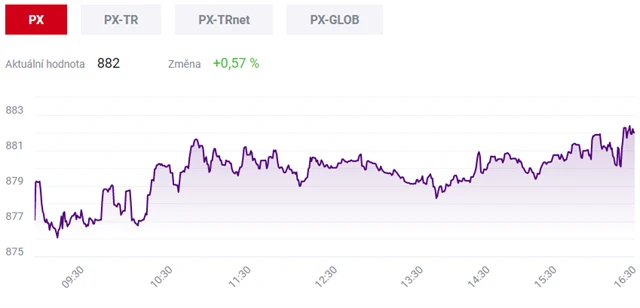 Pražská burza v pondělí posílila, index PX přidal 0,57 % na 882 bodů. Dařilo se většině titulů na hlavním trhu, přičemž bankovní tituly skončily na obou stranách výkonnostního spektra.