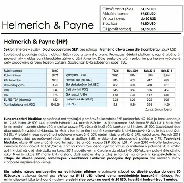 Společnost Helmerich & Payne poskytuje služby v oblasti těžby ropy a zemního plynu. Provozuje těžební platformy, ropné plošiny či provádí vrty v oblastech Mexického zálivu a Jižní Ameriky. Dále poskytuje smluvním partnerům vyškolené čety pracovníků a různá těžební zařízení. Akcie firmy by mohly být na startu další růstové vlny a zdají se být atraktivní ke spekulativnímu vstupu do dlouhé pozice, samozřejmě v kombinaci s aktivním prodejním stop pokynem pro omezení ztráty v případě nepříznivého vývoje.