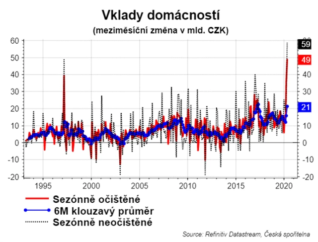 Vklady domácností v dubnu obvykle rostou více. Sezónní očištění pak letošní nárůst stlačí z 59 na 49 miliard korun. Také je potřeba si uvědomit, že domácnosti obvykle zvyšují své úložky v bankách. Prostě jim rostou příjmy, takže část růstu není způsobená vyšším sklonem k úsporám. Průměrný měsíční růst vkladů domácností za posledních šest měsíců je 21 miliard korun. Nadměrných tedy v dubnu bylo zhruba oněch 28 miliard rozdílu.