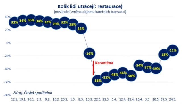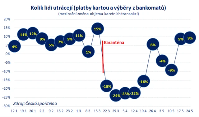 Ano, po zavedení plošné karantény objem karetních transakcí dramaticky spadl. Nicméně s uklidněním epidemiologické situace a rozvolňováním karanténních opatření jsou poklesy stále méně výrazné. V květnu se pak meziroční vývoj dokonce dva týdny po sobě vrátil na úrovně z doby před pandemií.