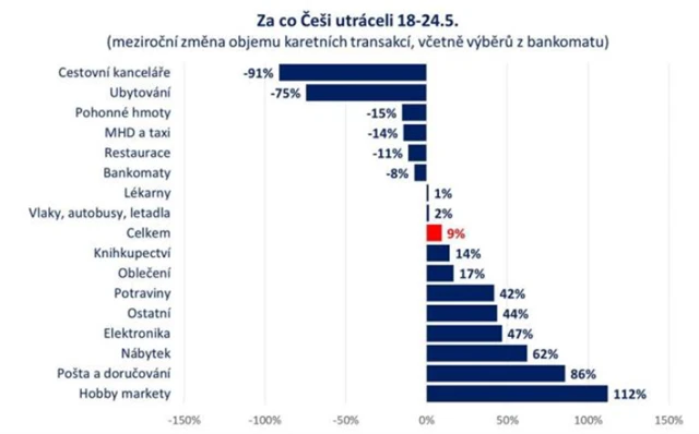 V nákupech vede vše spojené s domovem (potraviny +40 %, elektronika +50 %, nábytek +60 %, hobby markety +110 %). Výdaje spojené s "venkovním světem" nadále klesaly (cestovní kanceláře -90 %, ubytování v hotelech a penzionech -75 %, benzín a nafta -15 %, MHD -14 %, restaurace -11 %). Pokud bychom předpokládali, že podobné rozdělení zůstane, mohli bychom pracovat s hypotézou, že jsme se uhnízdili ve svých domovech, příliš nepočítáme s dovolenou mimo domov, a tak si jej vylepšujeme, jak můžeme.