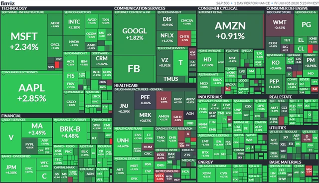 Výnosy amerických státních dluhopisů se po zprávě o nezaměstnanosti zvýšily, což pomohlo k růstu bankovním společnostem. Posílily rovněž letecké společnosti, jež patří mezi nejvíce zasažené koronavirovou krizí. Růst zaznamenalo všech 11 velkých dílčích sektorů, které jsou součástí indexu S&P 500.