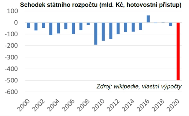 Původně se plánoval schodek 40 miliard Kč, poté 200 miliard, poslední schválená verze je 300 miliard Kč. Pokud nový vládní návrh dojde naplnění, výsledkem bude další z tragikomických hokejkových grafů, které v posledních týdnech přicházejí z různých sfér ekonomiky a ve kterých se letošek zcela vymyká historii.