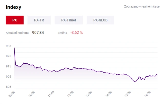 Pražská burza ztrácela třetí den v řadě poté, co na zahraničních trzích pokračovaly výprodeje. Index PX nakonec ve čtvrtek odepsal 3,62 % na 907 bodů. Největší ztráty registroval opět bankovní sektor.