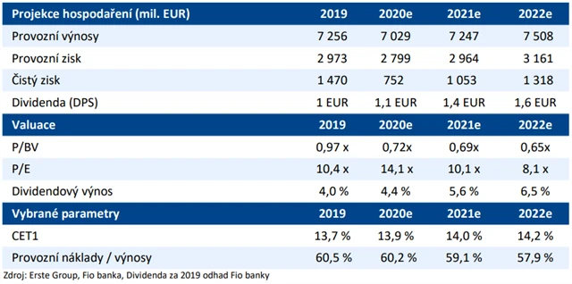 Fio banka odhaduje, že za letošní rok vykáže Erste zisk na akcii 1,8 eura, za rok 2021 pak 2,5 eura. Tržní odhad podle dat agentury Bloomberg hovoří o zisku 1,7 eura na akcii letos a 2,2 eura na akcii v roce 2021.