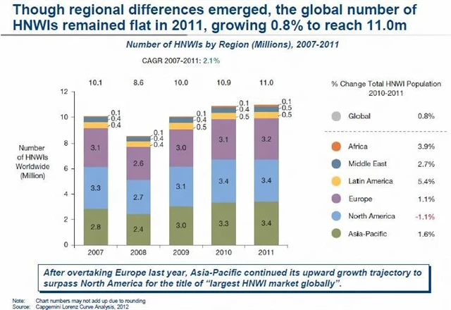 Letošní zpráva o světovém bohatství odhalila, že v průběhu roku 2011 vzrostl v Asii a Tichomoří počet dolarových milionářů o 1,6 % na 3,37 milionu. Region Asie a Tichomoří tak poprvé překonal Severní Ameriku, mezi jejíž populací najdeme 3,35 milionu dolarových milionářů. Severní Amerika přesto zůstává oblastí s největší koncentrací světového bohatství, tedy 11,4 bilionu dolarů ve srovnání s 10,7 bilionu v Asii a Tichomoří.