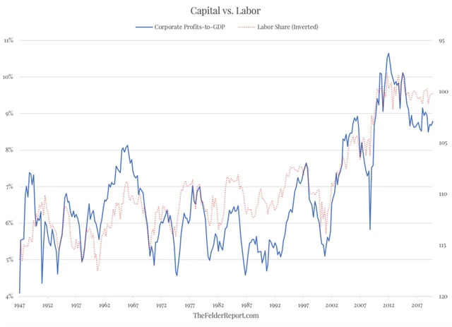 Na konci roku 1999 Warren Buffett prohlásil, že "člověk musí být velkým optimistou, aby věřil, že zisky firem v poměru k HDP mohou dlouhodobě převyšovat 6 %", a řekl, že pokud investoři budou ukusovat stále větší část z 'ekonomického koláče', logicky bude na ostatní skupiny lidí vycházet stále menší podíl, což vyústí v politické problémy.