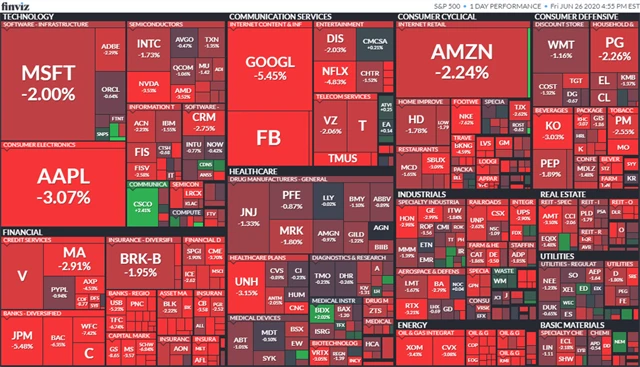 Americké akcie v pátek prudce oslabily, protože úřady v některých částech Spojených států kvůli růstu počtu případů nákazy koronavirem omezují podnikatelské aktivity. Finanční společnosti se navíc dostaly pod tlak poté, co americká centrální banka omezila největším komerčním bankám v USA výplatu dividend a nejméně do konce září jim zakázala odkupy vlastních akcií.