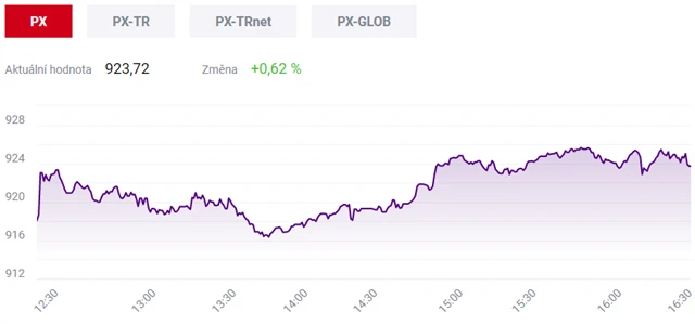 Pražská burza ve středu posílila, index PX stoupl o 0,62 % na 923,72 bodu. K růstu burze pomohly především emise bank, zatímco třeba akcie energetické firmy ČEZ ztrácely.
