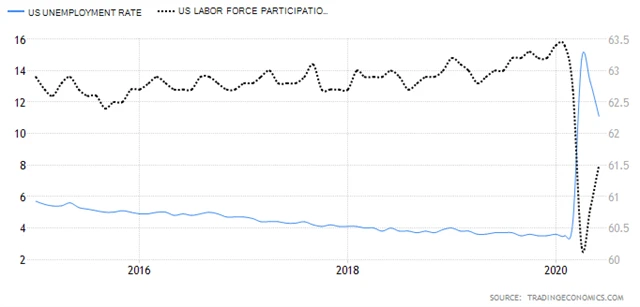 Míra participace, vyjadřující zapojení práceschopných lidí (zaměstnaných i nezaměstnaných) na trhu práce USA, v červnu stoupla na 61,5 % z 60,8 % v květnu. Míra nezaměstnanosti U6, jež bere v úvahu také ty, kteří už hledání práce vzdali, a rovněž ty, kteří jsou zaměstnáni jen na částečný úvazek, ačkoli by chtěli pracovat na plný, se snížila na 18 % z 21,2 %.