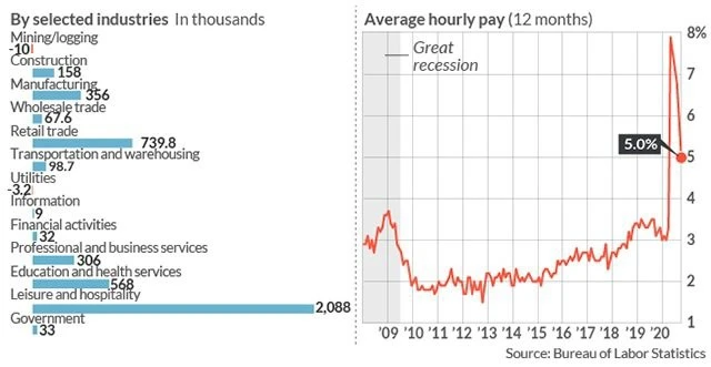 Průměrná hodinová mzda v červnu meziročně vzrostla o 5 %, v květnu růst činil 6,6 % (revidováno z 6,7 %). Proti květnu mzda v červnu klesla o 1,2 % po poklesu o 1 % v předchozím měsíci. Stále vysoký meziroční růst mezd potvrzuje, že nejvíce byla pandemií zasažena hůře placená místa.