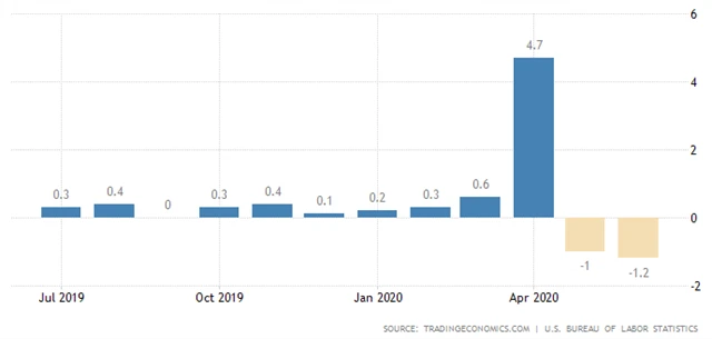 Spotřebitelské ceny ve Spojených státech v květnu meziročně vzrostly o 0,1 % po růstu o 0,3 % v předchozím měsíci. Jde o nejnižší roční míru inflace od roku 2015. V meziměsíčním srovnání spotřebitelské ceny klesly o 0,1 % po poklesu o 0,8 % v předchozím měsíci.
