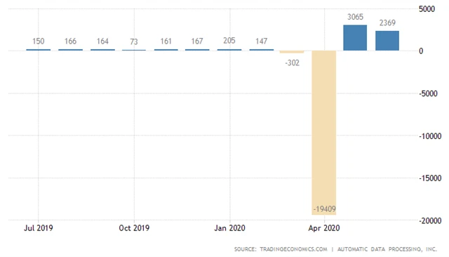 Podle středečních údajů agentury ADP soukromí zaměstnavatelé v USA v červnu vytvořili asi 2,37 milionu míst. Analytici v průměru odhadovali, že vznikly asi tři miliony pracovních příležitostí po přírůstku přibližně 3,07 milionu míst v květnu (revidováno z -2,76 milionu).