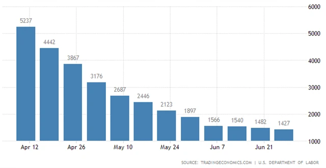 Další čtvrteční data z trhu práce ukázala, že o podporu v nezaměstnanosti požádalo v USA v minulém týdnu 1,427 milionu lidí. Výsledek je lepší než před týdnem, kdy to bylo 1,482 milionu (revidováno z 1,480 milionu), ale horší, než čekali analytici (1,355 milionu).
