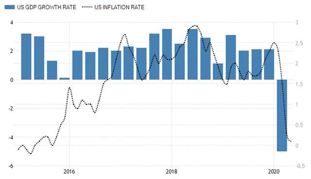 Americká ekonomika v prvním čtvrtletí zaznamenala nejhlubší propad od globální finanční krize před více než deseti lety. Hrubý domácí produkt se v přepočtu na celý rok snížil o 5 % po růstu o 2,1 % v předešlém čtvrtletí.