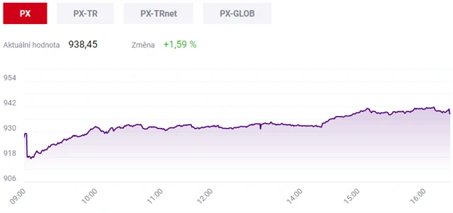 Pražská burza ve čtvrtek opět posílila. Index PX stoupl o 1,59 % na 938,45 bodu. Burze znovu pomohl růst akcií bank, zatímco akcie energetické firmy ČEZ výrazně ztratily kvůli pozbytí práva akcionářů na dividendu.