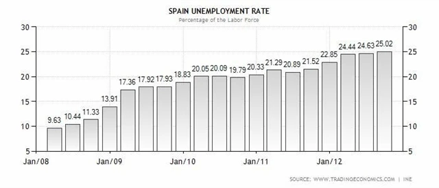 Výnosy španělských dluhopisů dnes rostou o více než 3 %. Kromě nejisté situace v řadě autonomních oblastí Španělska investorům kazí náladu i další nárůst celkové míry nezaměstnanosti. Ta ve třetím čtvrtletí 2012 překonala hranici 25 %.