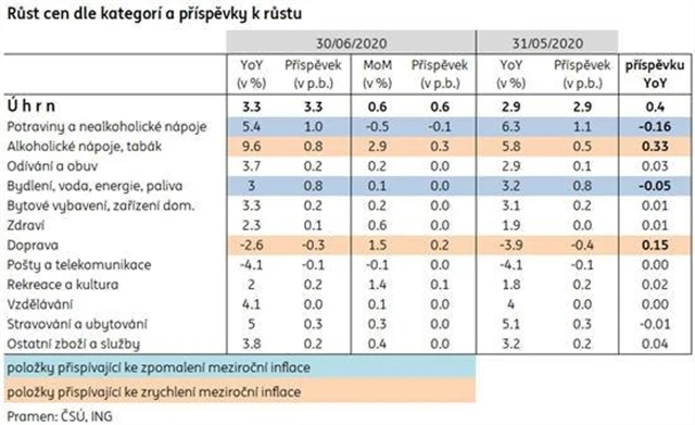 "Hlavní příčinou nečekaného zrychlení červnové inflace byly ceny alkoholických nápojů a tabáku, kde se projevil postupný náběh vyšší spotřební daně. Ceny tabákových výrobků tak meziročně zrychlily z květnových 7 % na 12 %. Kategorie 'alkoholické nápoje a tabák' tak vysvětluje většinu červnového zrychlení růstu cen. Mírně v červnu zrychlily také ceny pohonných hmot (o 3 %), z meziročního pohledu jsou však jejich ceny stále zhruba o 20 % nižší. Stejně jako v minulém měsíci dále vzrostly ceny automobilů, k růstu meziroční inflace v červnu tak mírně přispěla i kategorie 'doprava'. Naopak poprvé od září minulého roku meziměsíčně poklesly ceny potravin, a jejich příspěvek k růstu inflace se tak zmírnil," upozornil Jakub Seidler, hlavní ekonom ING Bank pro ČR.