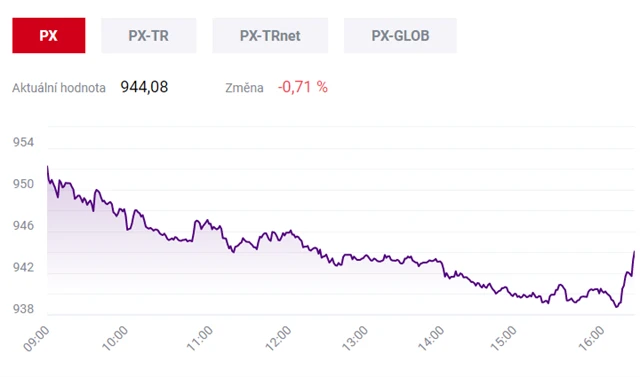 Pražská burza dále oslabila, index PX ve středu klesl o 0,71 % na 944,08 bodu. Nedařilo se většině emisí v čele s Erste Group Bank, jejíž akcie spadly o téměř 2,4 %. O procento a půl zlevnily také cenné papíry Komerční banky, ztrácel i ČEZ nebo pojišťovna VIG. Naopak se ziskem uzavřely technologická společnost Avast a MONETA Money Bank.