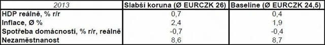Pokud ale ČNB bude chtít zdůvodnit potřebu oslabit korunu, může poukázat na zápornou poptávkovou inflaci jako na trvající deflační hrozbu. Zde je ovšem problém – oslabení koruny zvýší dovozní ceny, což se negativně dotkne spotřeby domácností. Slabší koruna (na úrovni EURCZK 26 celý příští rok) by průměrnou inflaci zvýšila odhadem o zhruba 0,5 procentního bodu na 2,4 %, což by se negativně projevilo na spotřebě domácností. Celkový agregátní efekt je však mírně pozitivní – lepší průmysl a nižší dovoz by zvedly HDP zhruba na 0,7 až 0,8 % meziročně. Dopad na trh práce je však malý (nezaměstnanost proti základnímu scénáři klesne o necelou desetinu procentního bodu). Otázkou je rovněž míra zajištění firem, která může efekt slabší koruny dále snížit.