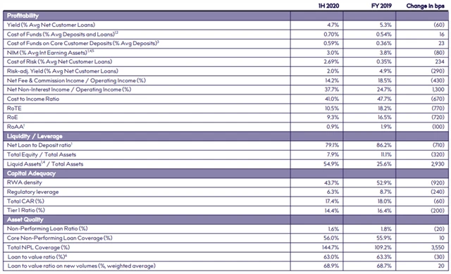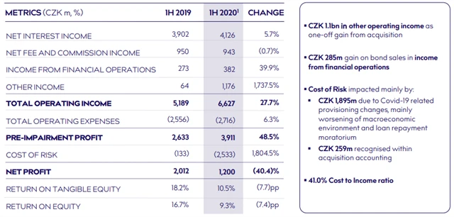 Čistá úroková marže dosáhla v prvním pololetí 3,0 % oproti 3,8 za loňský rok. Společnost má nadále silnou kapitálovou pozici, poměr Tier 1 dosahoval na konci prvního čtvrtletí 14,4 %, na konci roku 2019 byl na úrovni 16,4 %.