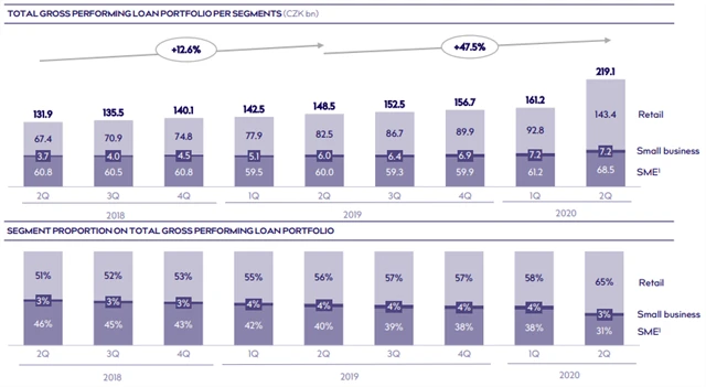 Bilance hrubých retailových úvěrů se i díky akvizici aktiv Wüstenrotu v pololetí meziročně zvýšila o 73,8 % na 134,4 miliardy Kč, v segmentu hypotečních úvěrů došlo ke zvýšení bilance o 135,4 % na 87,7 miliardy Kč (akvírované portfolio: 38,6 miliardy Kč). Bilance hrubých úvěrů poskytnutých podnikům se meziročně zvýšila o 14,7 % na 75,7 miliardy Kč, z toho objem úvěrů pro malé firmy se zvýšil o 20,2 % na 7,2 miliardy Kč.