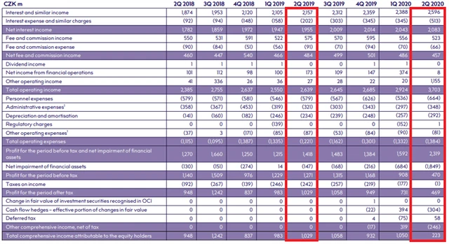 "Výsledky společnosti za druhé čtvrtletí skončily daleko za očekáváním, zejména kvůli vyšší tvorbě opravných položek, než se čekalo (v prvním pololetí celkově 2,5 miliardy Kč). Velká část z těchto opravných položek (1,9 miliardy Kč) byla spojena s pandemií nemoci covid-19 a zhoršenou makroekonomickou situací. V rámci příjmové linie příjmy z poplatků a provizí klesly více, než se čekalo, a výsledek z obchodování byl také horší, než se čekalo. Výhled na letošní rok je víceméně v souladu s očekáváním, spíše mírně lepší, než očekával konsenzus složený bankou. Výhled na rok 2021 je už vyšší, než se čekalo," napsal analytik Thomas Unger z Erste.