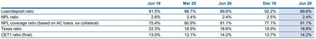 Poměr nesplácených úvěrů k celkovému objemu úvěrů klesl meziročně na 2,4 % z 2,8 %. Poměr úvěrů ke vkladům dosahoval na konci června 89,6 %, před rokem byl na úrovni 91,5 % a na konci března 2020 činil 88,7 %. Kapitálová přiměřenost CET 1 byla na konci června 14,2 %, na konci roku 2019 dosahovala 13,7 % a na konci března 2020 činila 13,1 %.