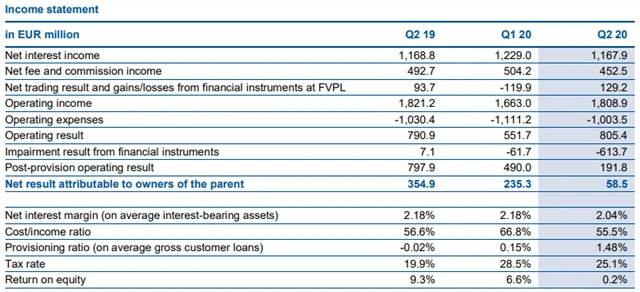 Za samotné druhé čtvrtletí skupina vykázala čistý úrokový příjem 1,17 miliardy eur (meziročně beze změny), čistý příjem z poplatků a provizí 452,5 milionu eur (2Q2019: 492,7 milionu eur) a čistý zisk z finančních operací 129,2 milionu eur (2Q2019: 93,7 milionu eur). Provozní příjmy v druhém čtvrtletí Erste klesly na 1,81 miliardy eur z 1,82 miliardy eur a čistý zisk se jí snížil na 58,5 milionu eur z 354,9 milionu eur.