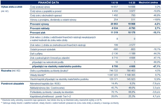 Provozní zisk se v pololetí snížil meziročně o 10,1 % na 10,2 miliardy Kč. Provozní výnosy klesly o 4,2 % na 20 miliard Kč. Jejich nejdůležitější složka, čistý úrokový výnos, zůstala na 14,7 miliardy Kč. Čistý výnos z poplatků a provizí se meziročně snížil o 10,6 % na 4 miliardy Kč.