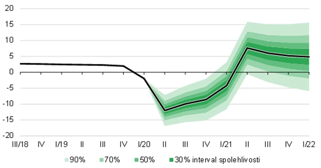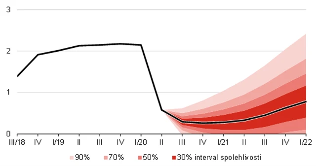 V aktualizované prognóze Česká národní banka zhoršila odhad vývoje české ekonomiky v letošním i příštím roce. Nově letos čeká pokles HDP o 8,2 % a příští rok růst o 3,5 %. V květnové prognóze počítala ČNB letos s poklesem ekonomiky o 8 % a příští rok s růstem o 4 %. Na 4% růst by se měla ekonomika podle centrální banky dostat až v roce 2022.