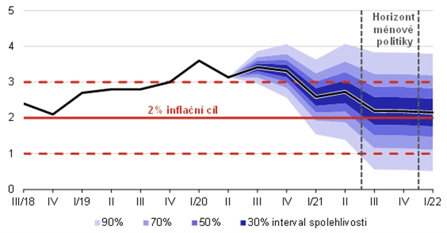 Celková inflace by podle ČNB měla činit ve třetím i čtvrtém čtvrtletí příštího roku 2,2 %. V předchozí prognóze ČNB očekávala ve třetím čtvrtletí 2021 inflaci 2,1 % a ve čtvrtém čtvrtletí 2,3 %.