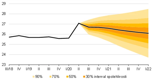 Zároveň v novém odhadu centrální banka počítá se silnější korunou. Nově čeká letos průměrný kurz 26,50 EUR/CZK a příští rok 26,40 EUR/CZK. V květnu odhadovala banka letošní kurz na 26,90 EUR/CZK a příští rok čekala úroveň 27,50 EUR/CZK.