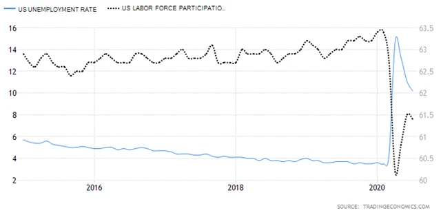 Dopady pandemie covidu-19 na americký trh práce byly poprvé vidět v číslech za březen, tehdy v americké ekonomice mimo zemědělství zaniklo asi 1,37 milionu míst. Šlo o první úbytek míst od roku 2010. Dramaticky se situace zhoršila v dubnu, kdy úbytek míst dosáhl 20,79 milionu. Míra nezaměstnanosti v březnu stoupla na 4,4 % z květnových 3,5 %, v dubnu vyskočila na 14,7 %, a byla tak nejvyšší od velké hospodářské krize z 30. let 20. století. V poválečné historii byl dosavadní rekord celkové míry nezaměstnanosti 10,8 %. V květnu se čekalo další zhoršení situace, na trh ale dorazila opačná čísla, nezaměstnanost klesla na 13,3 %.