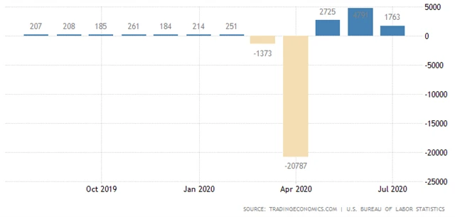 Ve Spojených státech v červenci mimo zemědělství vzniklo 1,76 milionu pracovních míst. Analytici odhadovali, že ekonomika vytvořila přibližně 1,6 milionu míst po 4,79 milionu v červnu (revidováno z 4,8 milionu). Celková míra nezaměstnanosti klesla na 10,2 % z 11,1 %, čekal se pokles jen na 10,5 %. Údaje v pátek zveřejnilo ministerstvo práce USA. Meziroční růst mezd v červenci zpomalil o desetinu procentního bodu na 4,8 %.