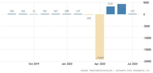 Podle středečních údajů agentury ADP soukromí zaměstnavatelé v USA v červenci vytvořili asi 167 tisíc míst. Analytici ale v průměru odhadovali, že vzniklo asi 1,5 milionu pracovních příležitostí po přírůstku přibližně 4,31 milionu míst v červnu (revidováno z 2,37 milionu).