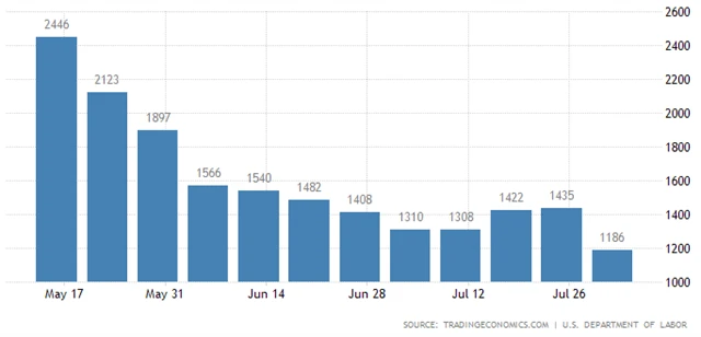 Čtvrteční data z trhu práce USA ukázala, že o podporu v nezaměstnanosti požádalo v týdnu do 1. srpna 1,186 milionu lidí. Výsledek je lepší než před týdnem, kdy to bylo 1,435 milionu (revidováno z 1,434 milionu), a také lepší, než čekali analytici (1,415 milionu).