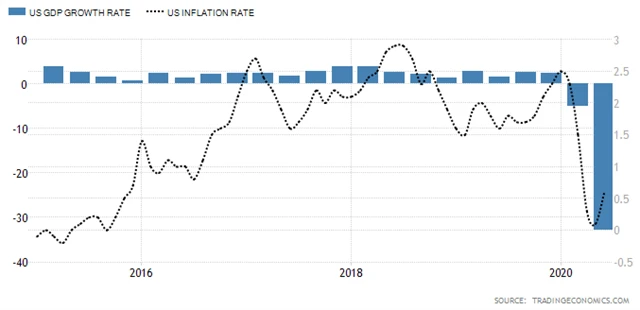 Americká ekonomika ve druhém čtvrtletí zažila nejhlubší propad v zaznamenané historii. Hrubý domácí produkt se v přepočtu na celý rok podle předběžných údajů amerického ministerstva obchodu snížil o 32,9 %, a to zejména kvůli citelnému propadu spotřebitelských výdajů. USA za sebou mají rekordně dlouhou ekonomickou expanzi, která trvala od roku 2009.