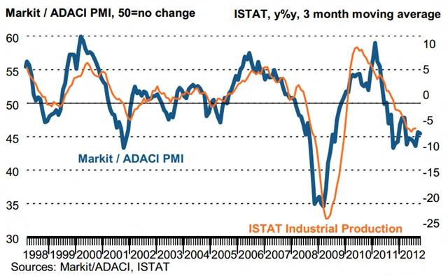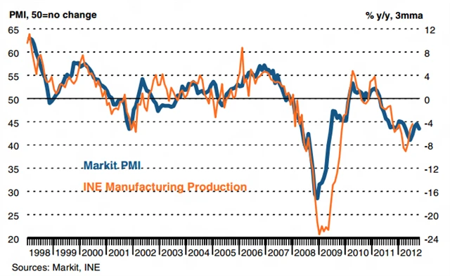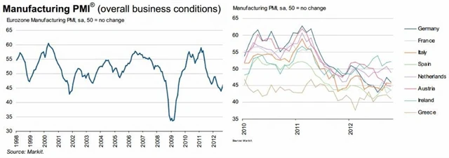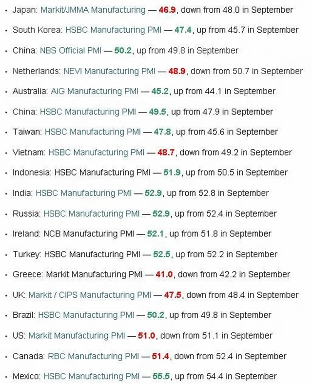 Konečné údaje indexů nákupních manažerů ve zpracovatelském průmyslu za říjen potvrdily, že Evropa stále čeká na výraznější oživení. Nic na tom nezměnilo ani několik pozitivních revizí předběžných (FLASH) čísel za říjen. Eurozóna je hluboko v pásmu poklesu, zatímco řada ekonomik v rámci emerging markets zažívá lepší měsíce nad 50 body.