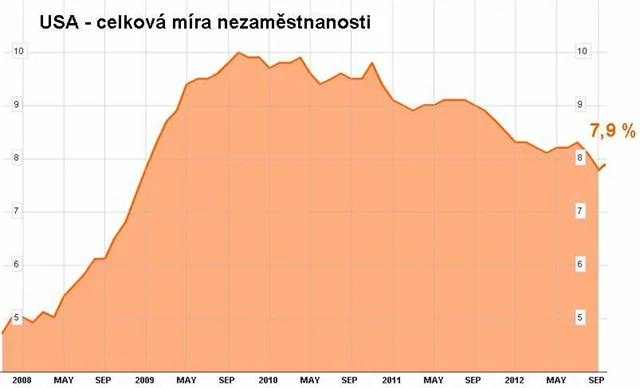 Celková míra nezaměstnanosti v USA v říjnu podle aktuálních údajů vzrostla na 7,9 %. Analytici oslovení agenturou Reuters čekali v průměru stagnaci na 7,8 %, případně mírný růst po rychlém zářijovém poklesu. Mimo zemědělství bylo ovšem vytvořeno 171 tisíc nových míst a zářijové údaje byly revidovány nahoru na 148 tisíc nových míst. Mírně klesla podzaměstnanost. Právě nová místa dělají z říjnového reportu dobrou zprávu, až v listopadové statistice se ovšem projeví následky bouře Sandy.