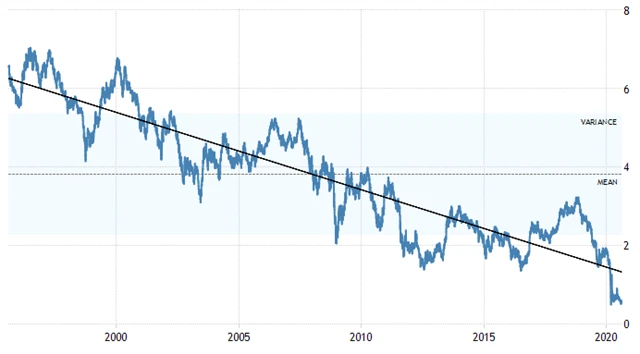 Vývoj výnosu 10letých dluhopisů USA, zdroj: tradingeconomics.com