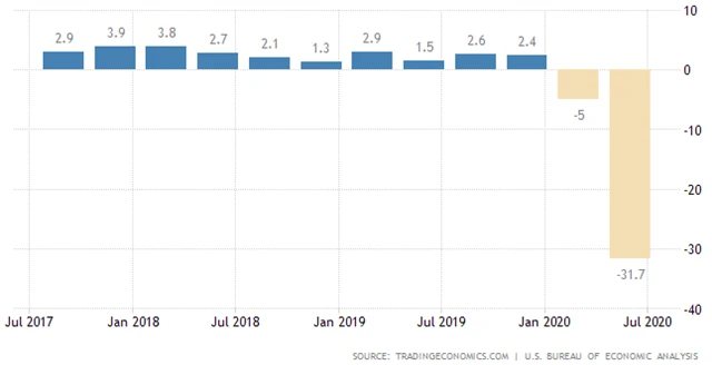 Americká ekonomika ve druhém čtvrtletí kvůli dopadům šíření nemoci covid-19 zažila nejhlubší propad v historii. Hrubý domácí produkt se v přepočtu na celý rok podle zpřesněných údajů snížil o 31,7 %. Oznámilo to ve čtvrtek americké ministerstvo obchodu. Výsledek je však nakonec lepší, než čekali analytici, kteří předpovídali po prvním odhadu propad HDP o 32,5 %.