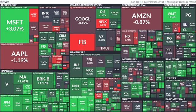 Index Dow stoupl o 0,57 % na 28 492,21 bodu a širší S&P 500 vzrostl o 0,17 % na nové zavírací maximum 3 484,55 bodu (absolutní rekord navýšil na 3 501,38 bodu), zatímco index technologického trhu Nasdaq Composite klesl o 0,34 % na 11 625,34 bodu (absolutní maximum ovšem během dne posunul na 11 730,01 bodu). Dow už od začátku roku klesá jen o 0,16 %, S&P 500 roste o 7,85 % a Nasdaq Composite přidává 29,56 %.